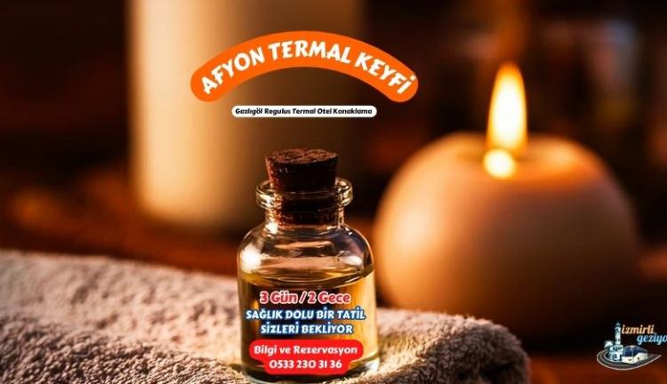Sabah saat 07:00'de önceden belirlenen noktalardan(Bostanlı İskele, Karşıyaka Anıt, Bornova E.Ü.H Önü, Şirinyer Nato, Üçyol, F.Altay) misafirlerimizi aldıktan sonraülkemizin jeotermal merkezi olandünyaca ünü yayılmış şifalı sularıyla meşhur Afyonkarahisar’a gidiyoruz. Türkiye’nin termal tatil denildiğinde ilk akla gelen şehirlerinden biri olan Afyon’da unutulmaz bir termal tatil deneyimi yaşayabilirsiniz. Tarih boyunca birçok medeniyete ev sahipliği yapmış olan Afyon, termal kaynaklar bakımından son derece zengin bir bölgedir. Avrupa’nın en iyi termal kaynaklarına sahip olan ülkemizin termal tatil için en ideal bölgesi olan Afyon’da sağlık, huzur ve dinlence dolu bir tatil sizleri bekliyor. Termal otelimize giriş yaptıktan sonra sağlık getiren suyun mucize dünyasında bedenimizi ve ruhumuzu yeniliyor, kendimizi ödüllendiriyoruz. Akşam yemeği ve konaklama otelimizde.